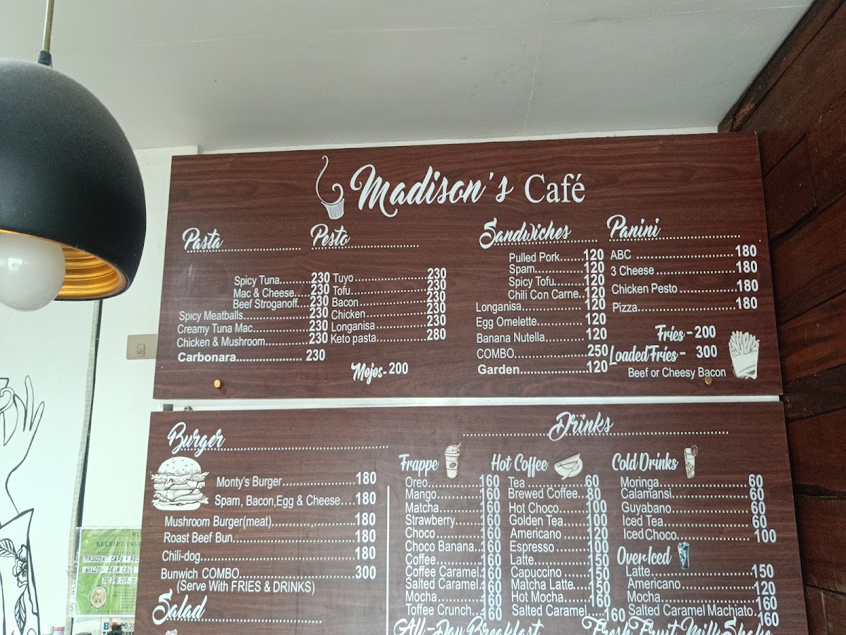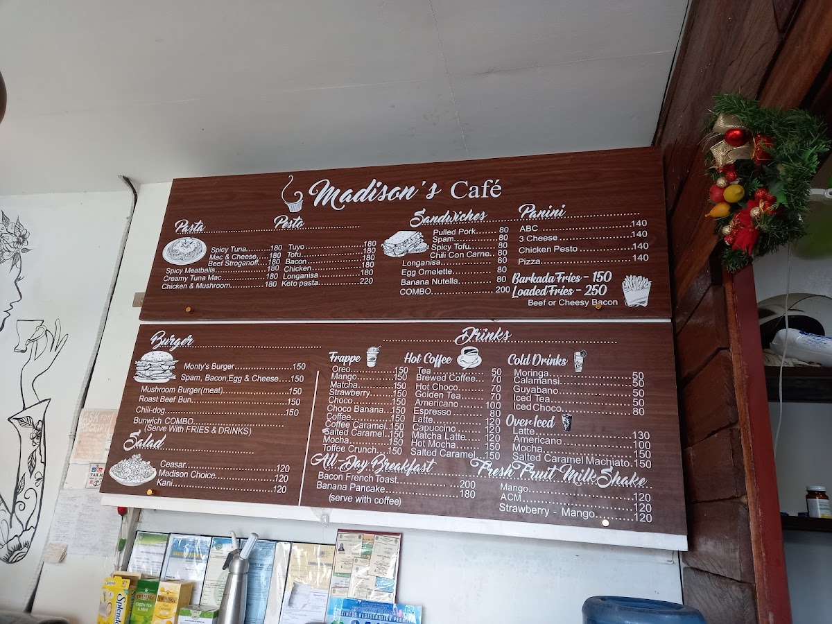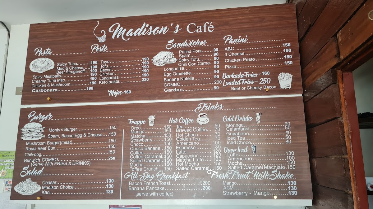 Madison's Cafe and Restaurant in Baler, Philippines, offers a delightful and diverse menu that caters to a wide range of tastes. The pasta section is a highlight, with options like Spicy Meatballs Spaghetti and Mac and Cheese, both priced to appeal to casual diners. For a more adventurous option, try the Spicy Tuna Spaghetti or the creamy Beef Stroganoff Spaghetti. Their salads, including the Caesar Salad and Madison's Choice Salad, provide fresh, crisp flavors perfect for a light meal or side dish.